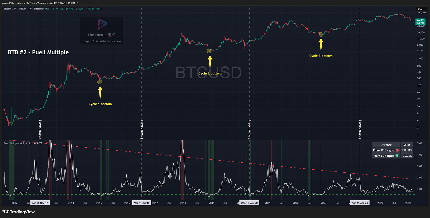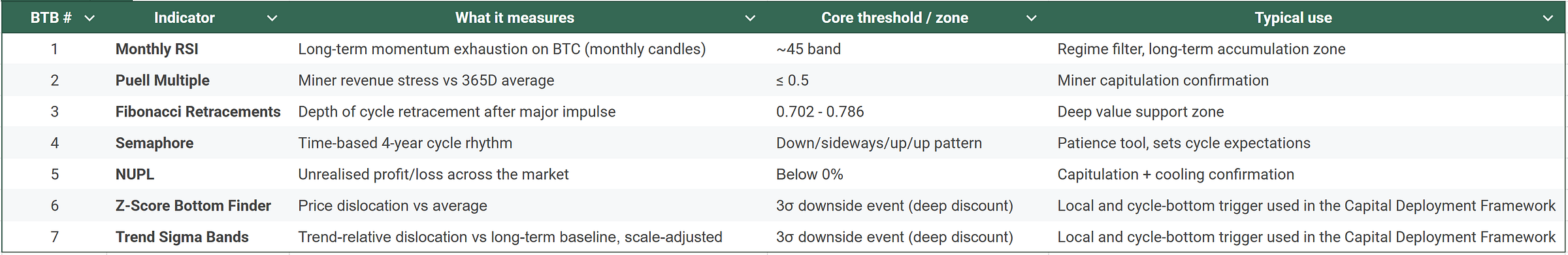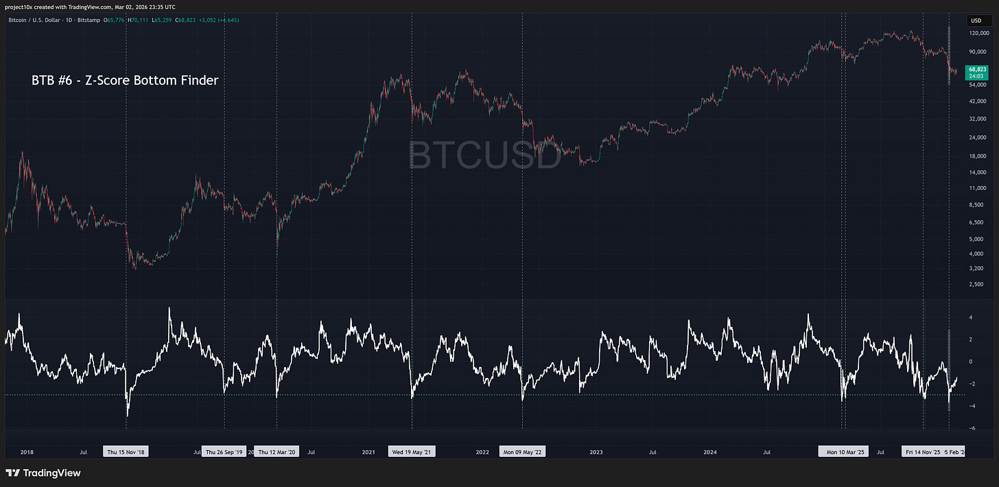 Most of the other BTB indicators are primarily cycle-bottom tools, especially BTB #1 through #5. They help identify when we’re in a broader regime where buying makes sense, even if the exact low takes time to form.