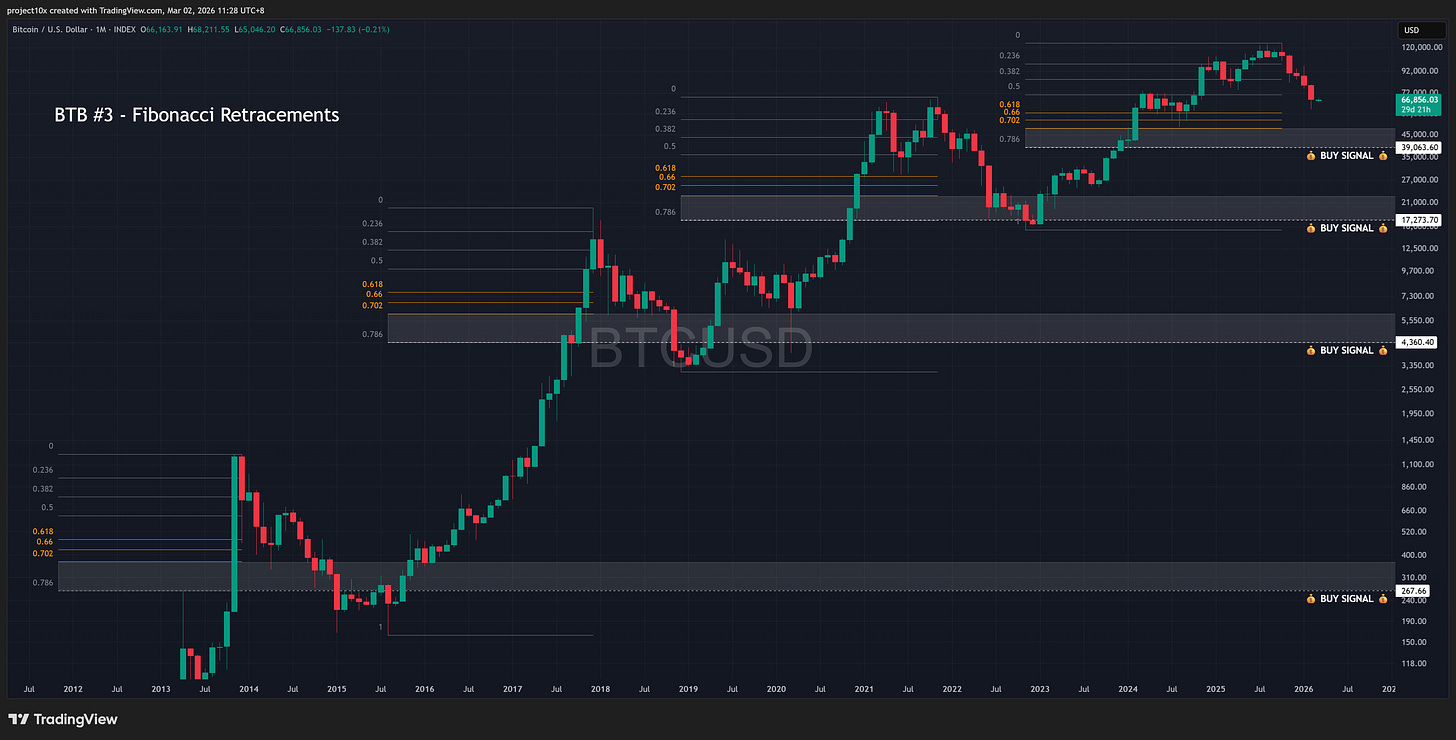 Across cycles, deep bear corrections have often found support in 0.702 - 0.786 retracement.