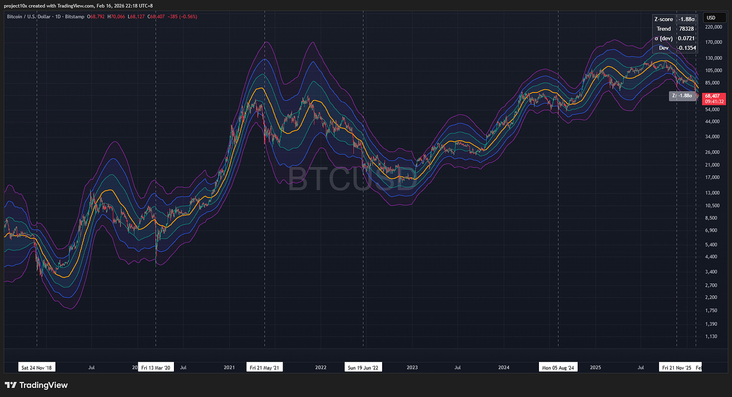 If price never reaches the band, that can still be bullish, it may reflect a structurally shallower drawdown. My base case (March 2026) is that we don’t see this level of drawdown given the bullish macro-backdrop.