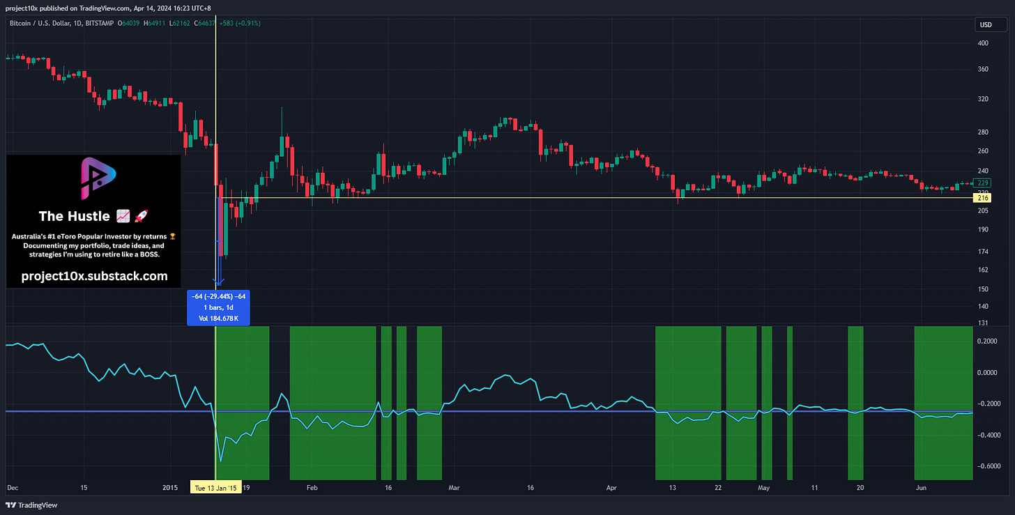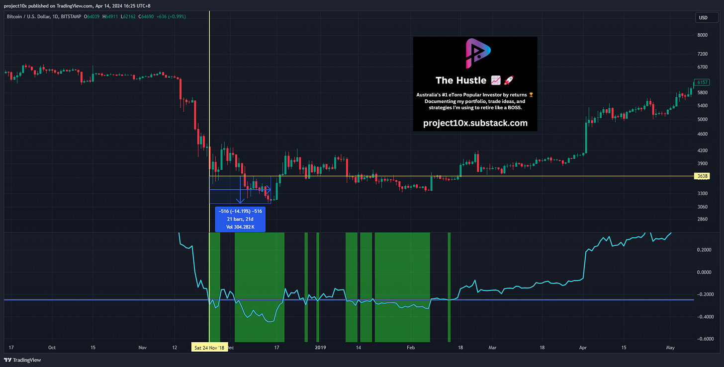 Signal: when the z-score (light blue line) hits -0.25 (purple line), it marked the local bottom within 2 weeks in the last 3 crypto cycles, using the D1 chart.