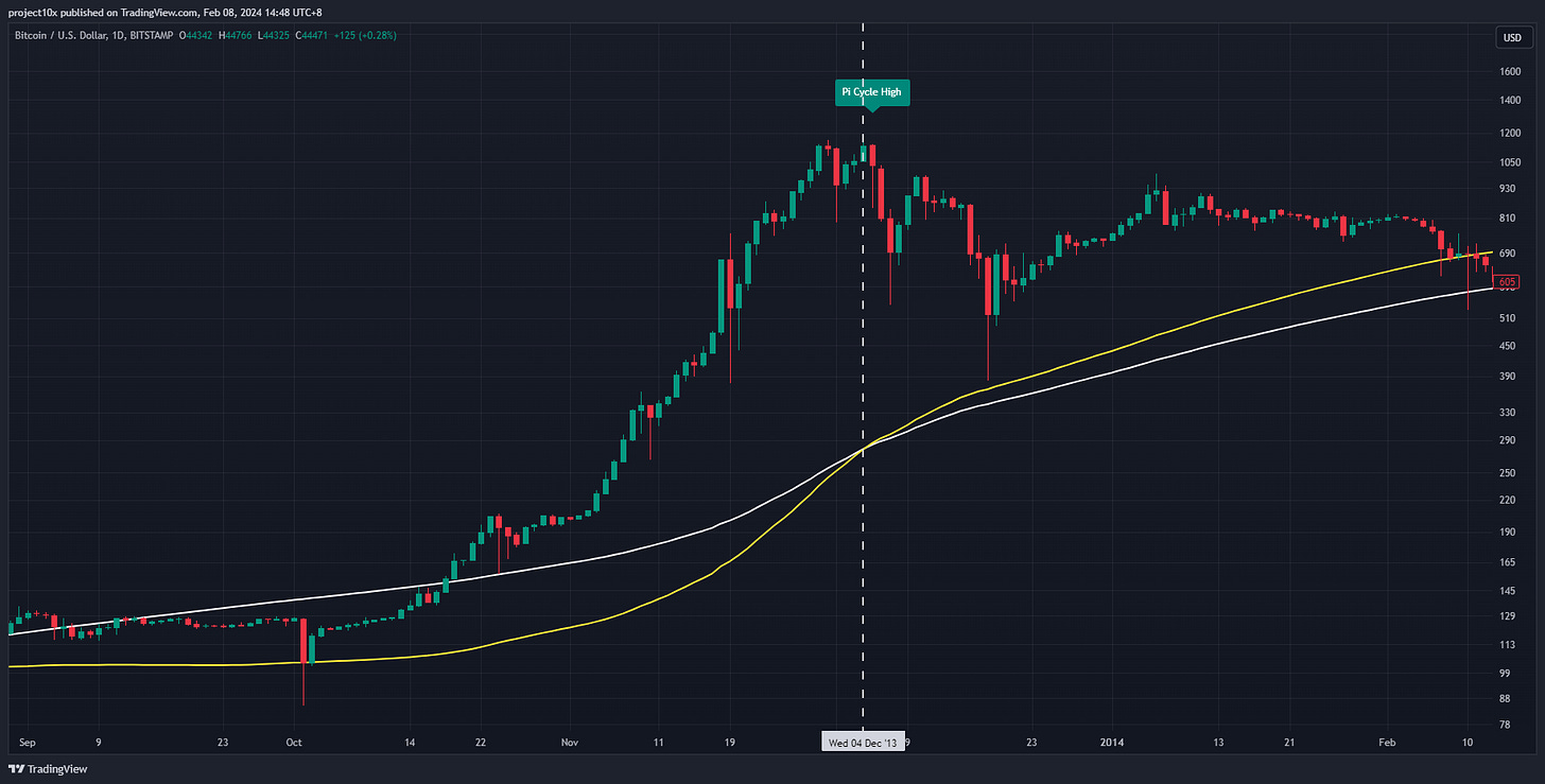 On the rare occasion where 111 MA crosses above the 2x350MA, it triggers the PI Cycle Top Signal.