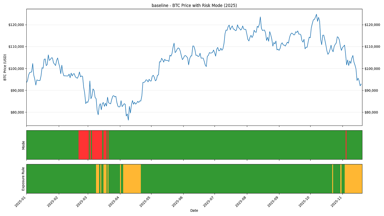 Example 4 (April 2025) and 5 (November 2025): after prolonged periods of RORO staying 🟢, the first appearance of 🔴 often signals that more downside is still ahead, even if RORO subsequently returns to 🟢.