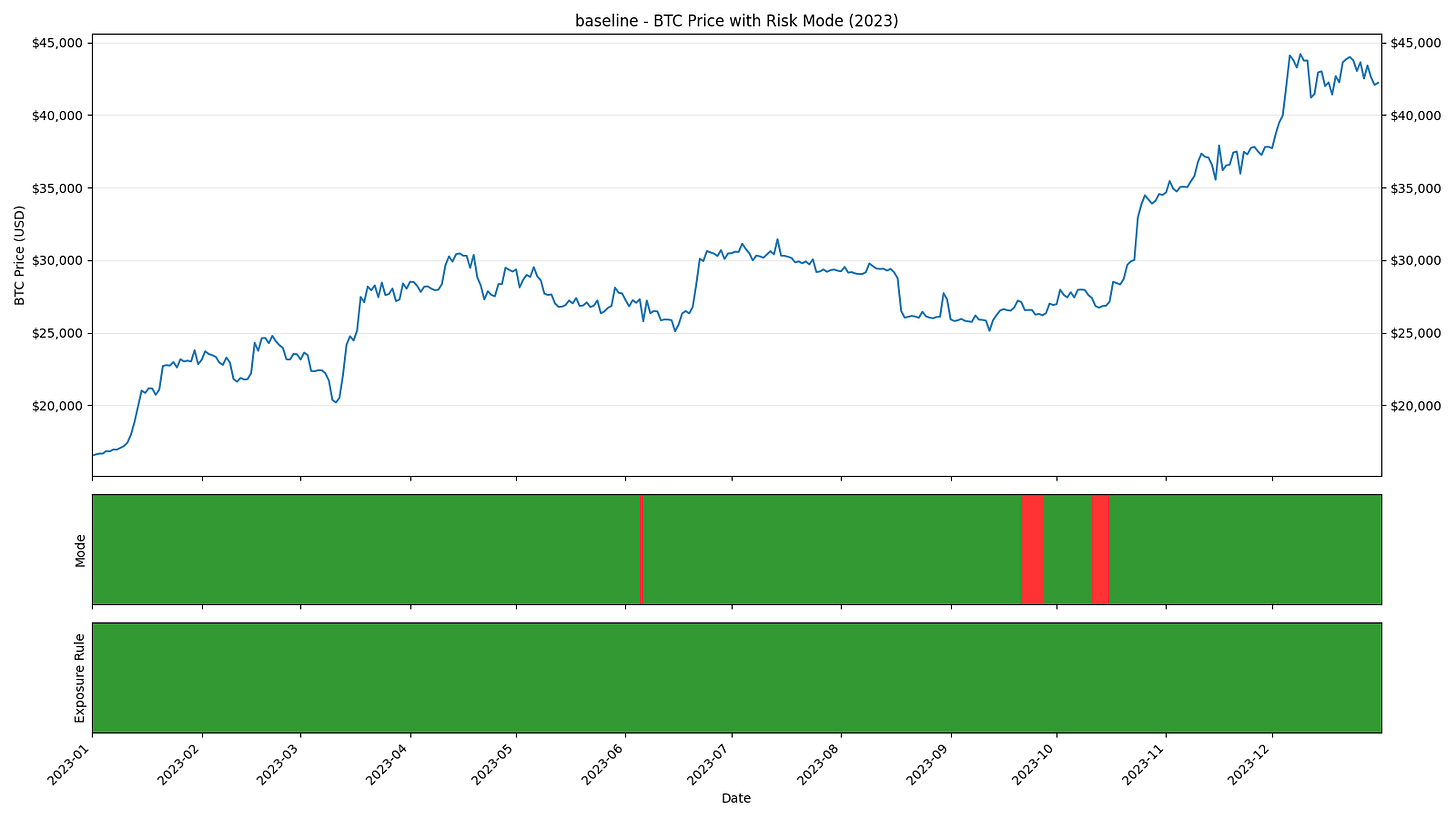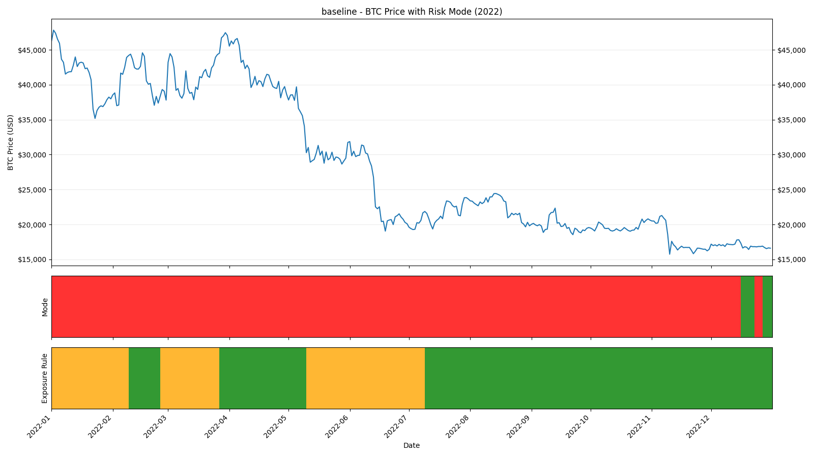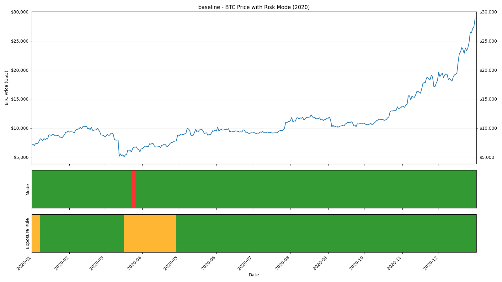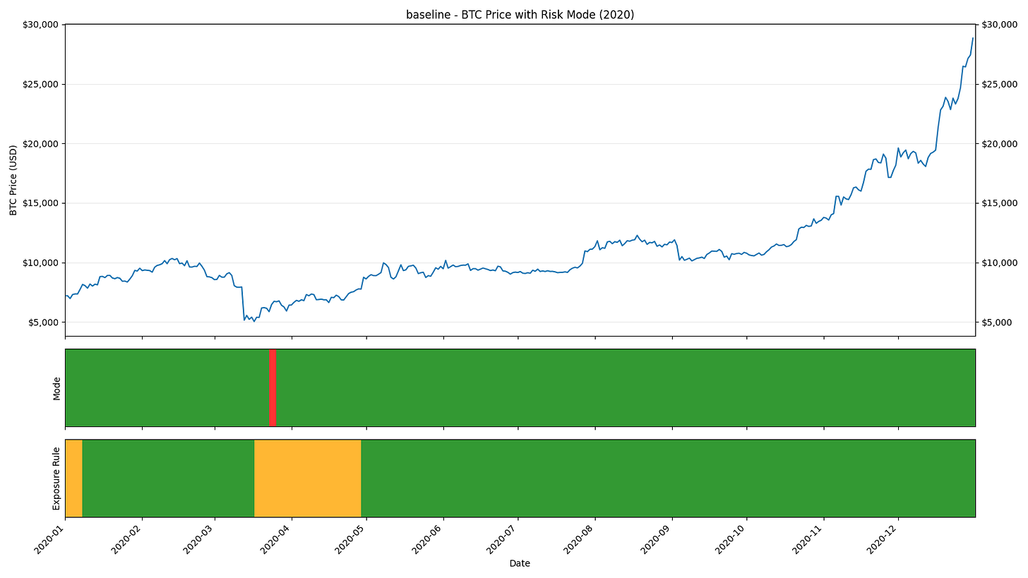 The max drawdown of -52% is materially lower than BTC’s drawdowns over the same period, despite vastly higher returns. It occurred during the March 2020 COVID crash black swan event - the RORO tool is not designed to capture black swan events.