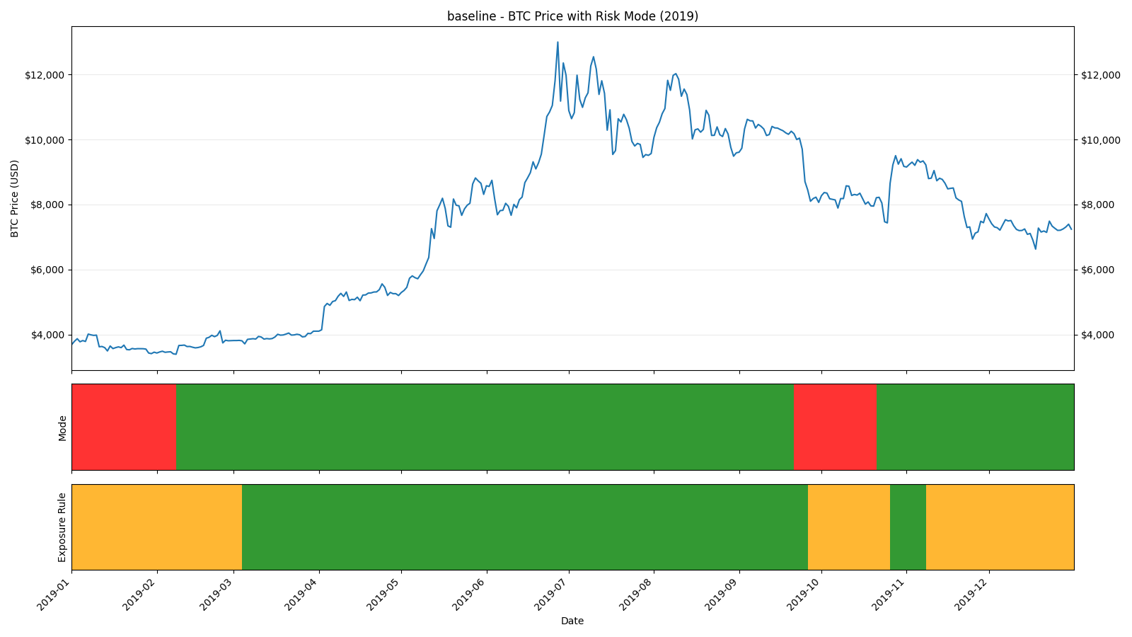 As momentum deteriorated later in the year, RORO flipped back to Risk-Off at $10.2K and ER flipped to 🟡 at $8.4K, reducing exposure while price was still elevated. BTC ultimately bottomed at $6.4K.