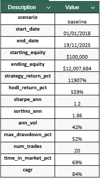 That trade count is a feature, not a bug. It reflects a system that stays invested during favourable regimes and steps aside only when conditions genuinely change.