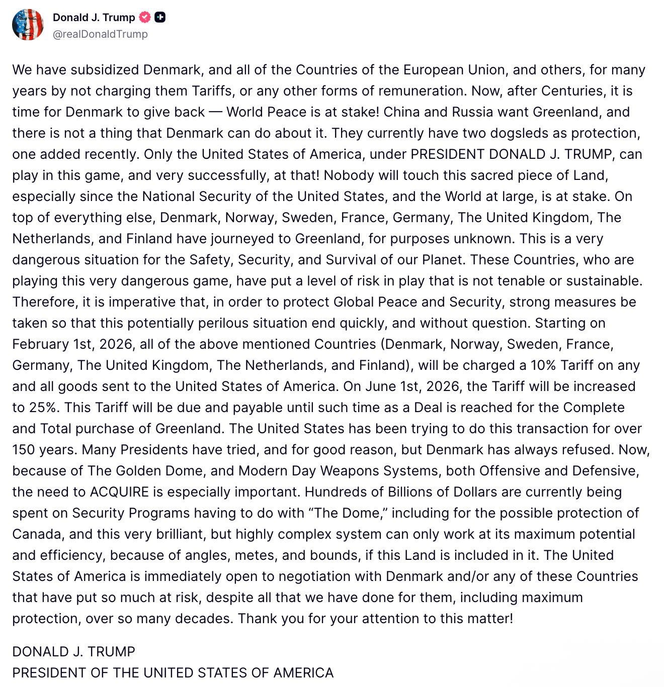 Fast forward a few days, and now we have POTUS saying certain NATO allies will face additional tariffs because they “dared” meet in Greenland to discuss how to respond to increasing pressure from POTUS.