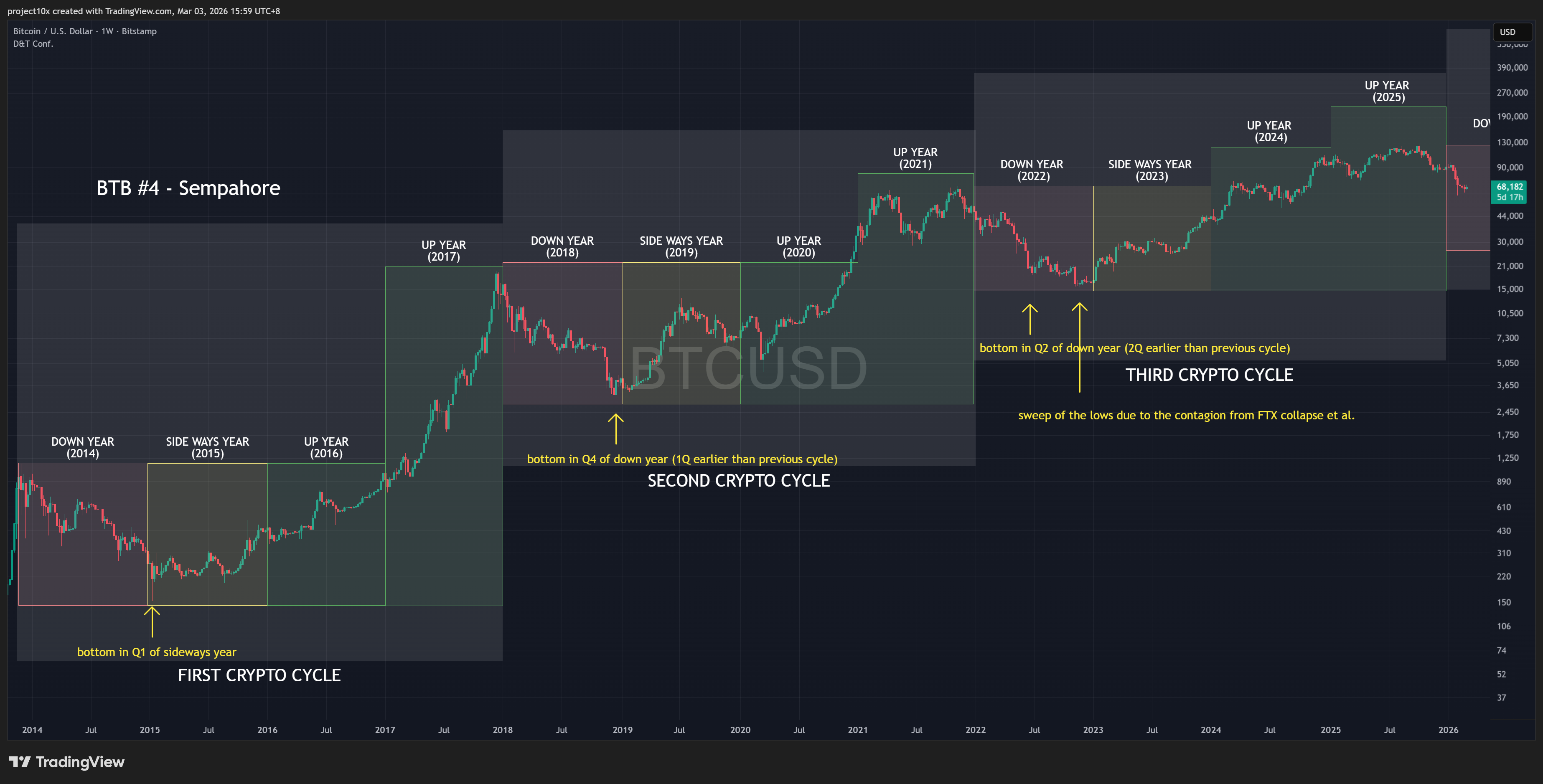 Third cycle: bottom in Q2 of the down year, followed by the FTX contagion sweep