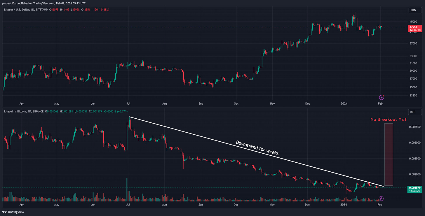 Signal: when LTC/BTC is trending down for weeks, followed by a strong breakout. Check out the first newsletter for historic examples.