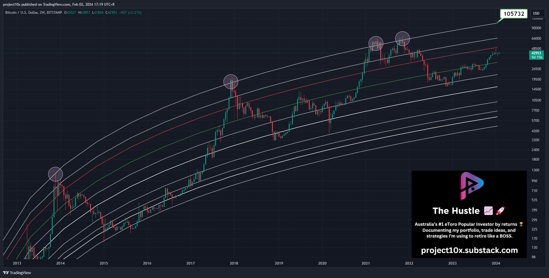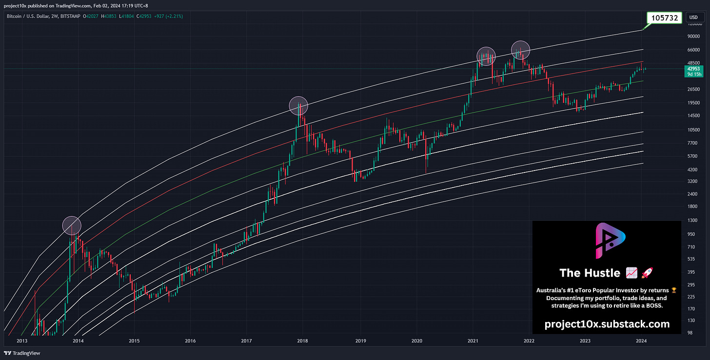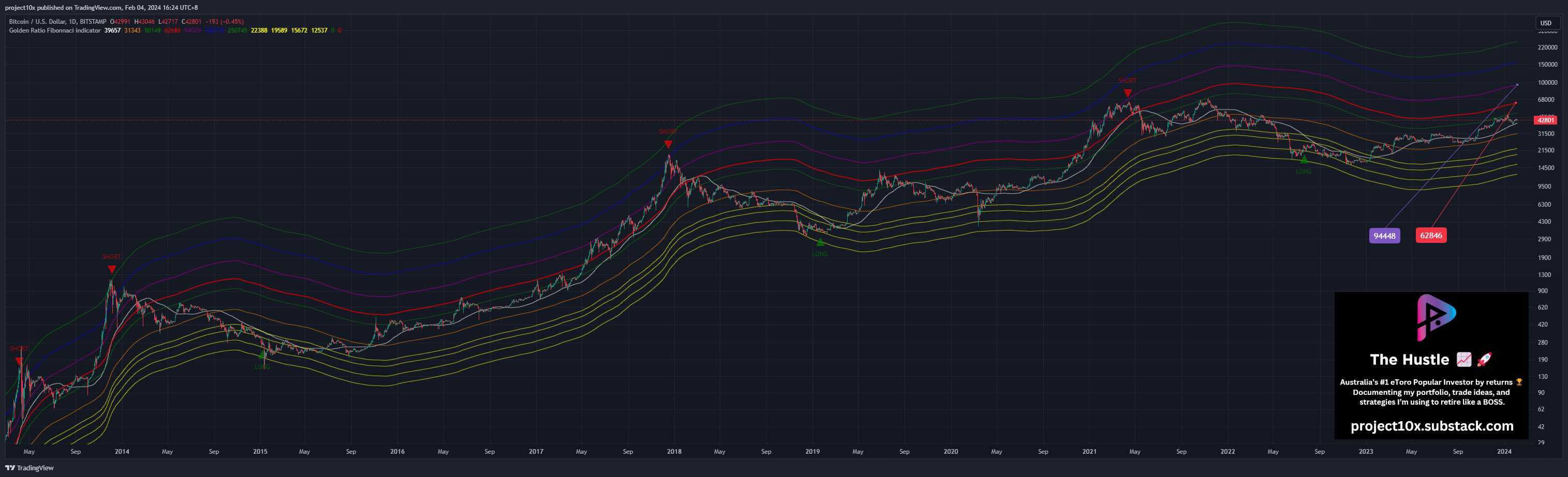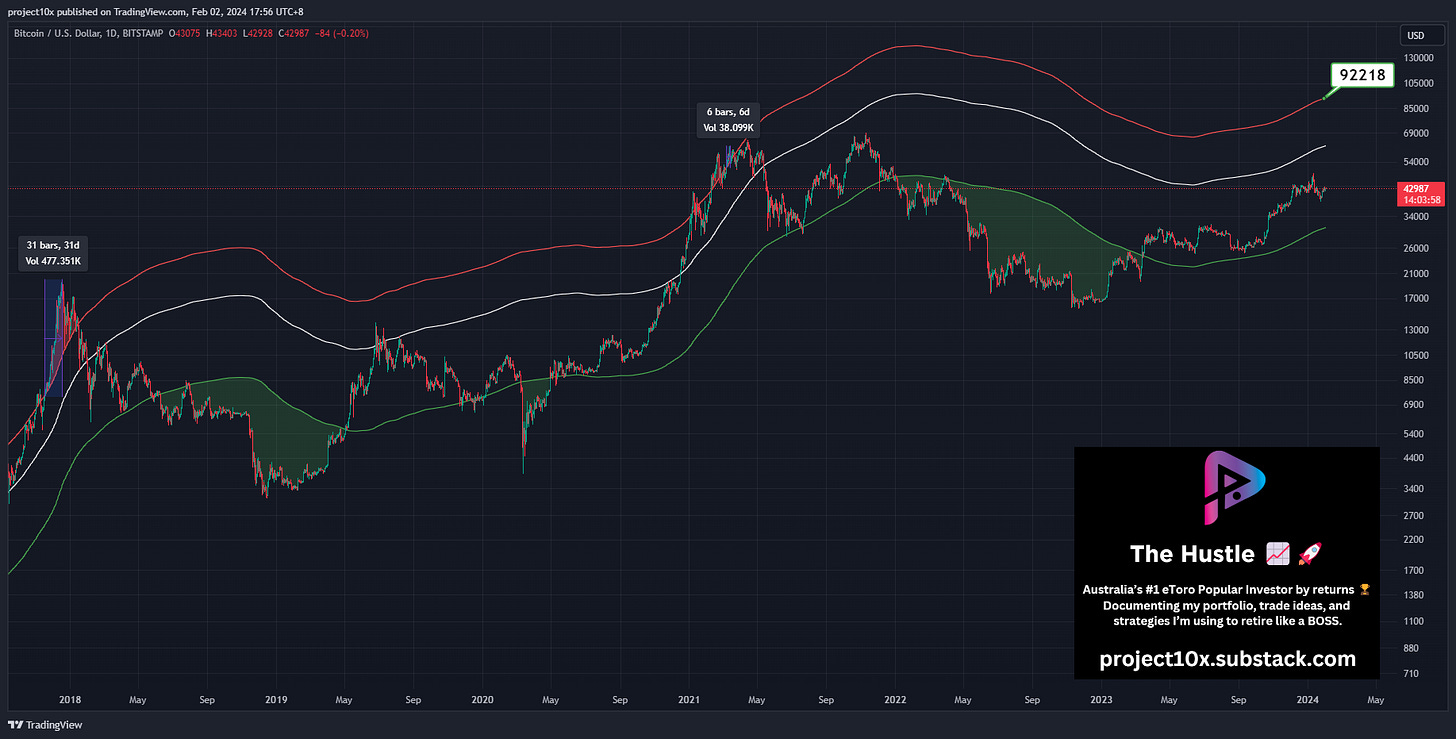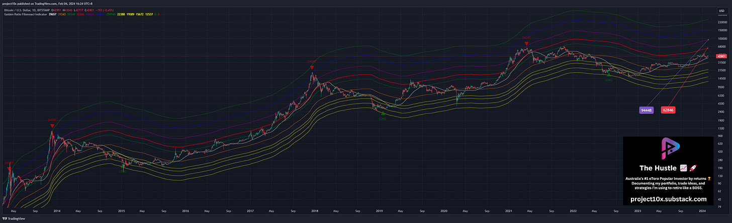 Status: Price is well below the red line (currently @ $62,846) and purple line (currently @ $94,448)
