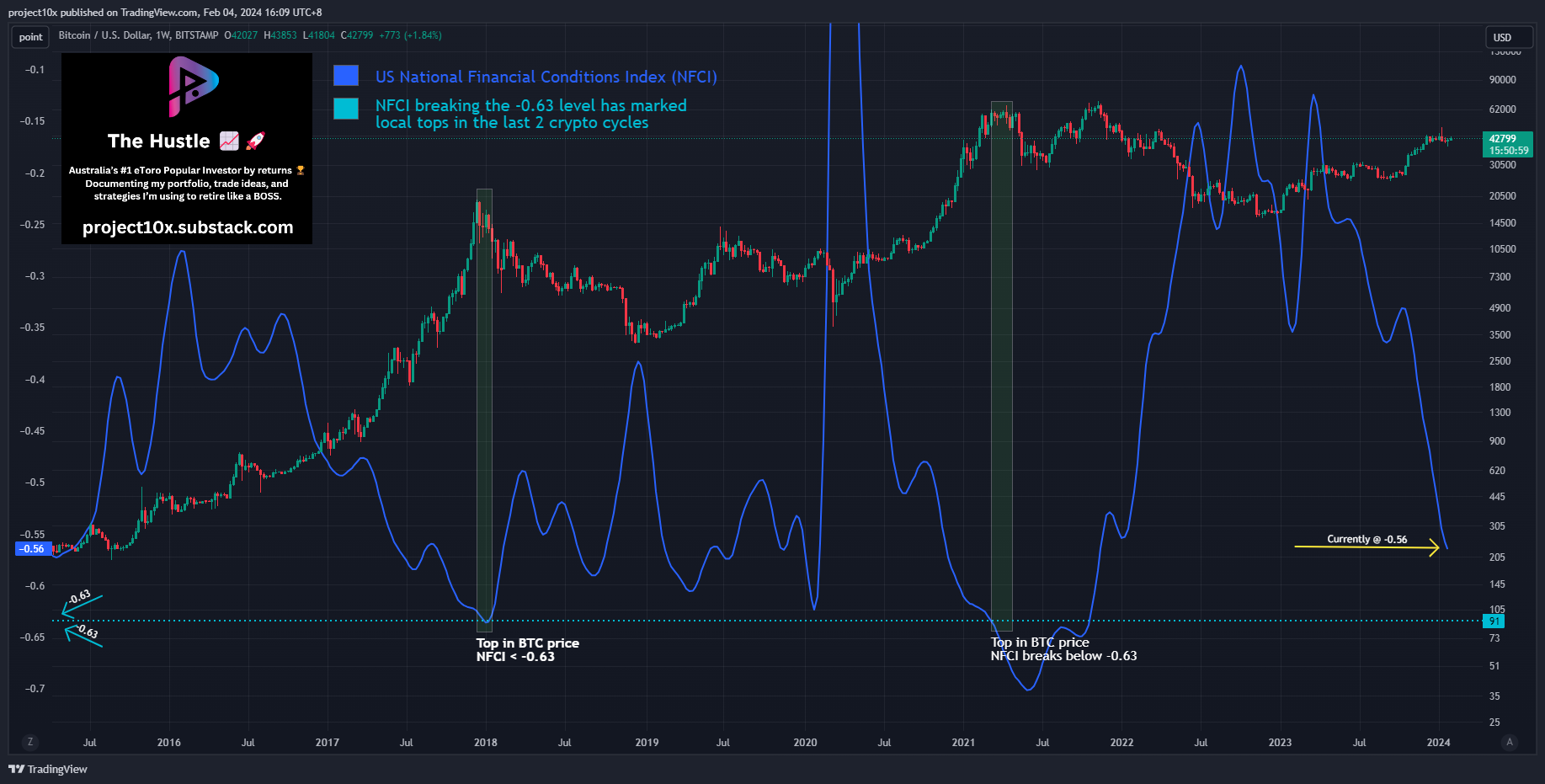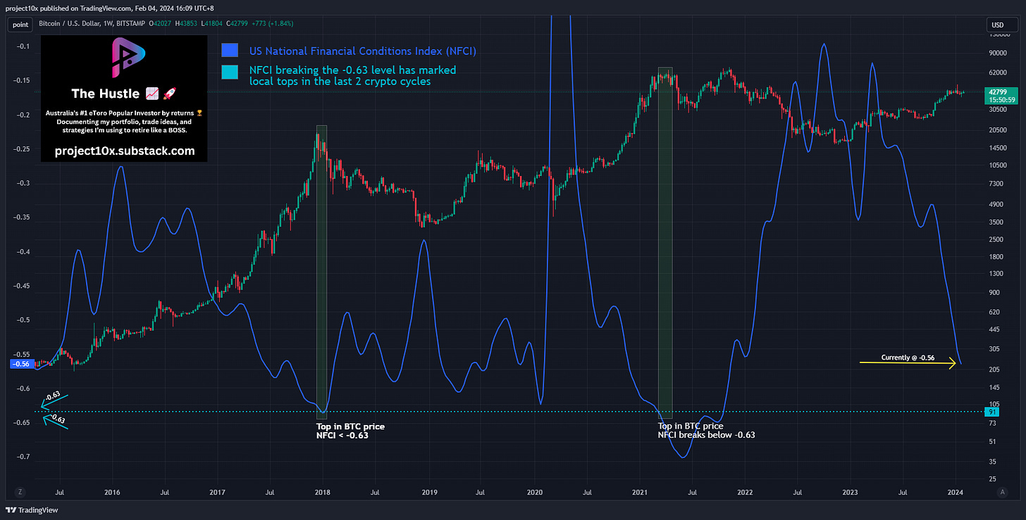Signal: when NFCI breaks the -0.63 level it has marked the local top in the last 2 crypto cycles.