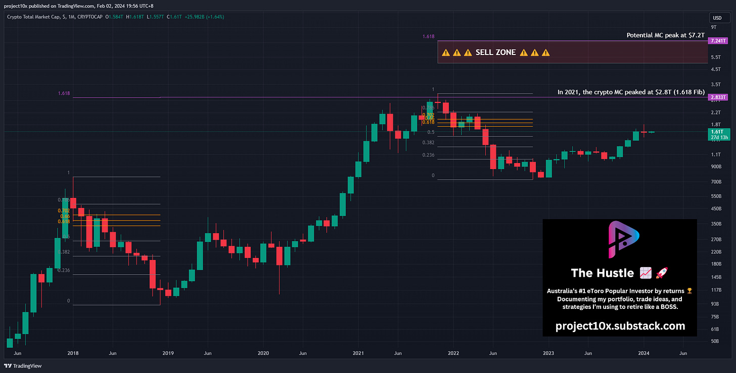 Signal: when total crypto Market Capitalisation (MC) hits the 1.618 Fib at $7.2T. I have also labelled a sell zone above $5T. The price at which I think it makes sense to start scaling out.