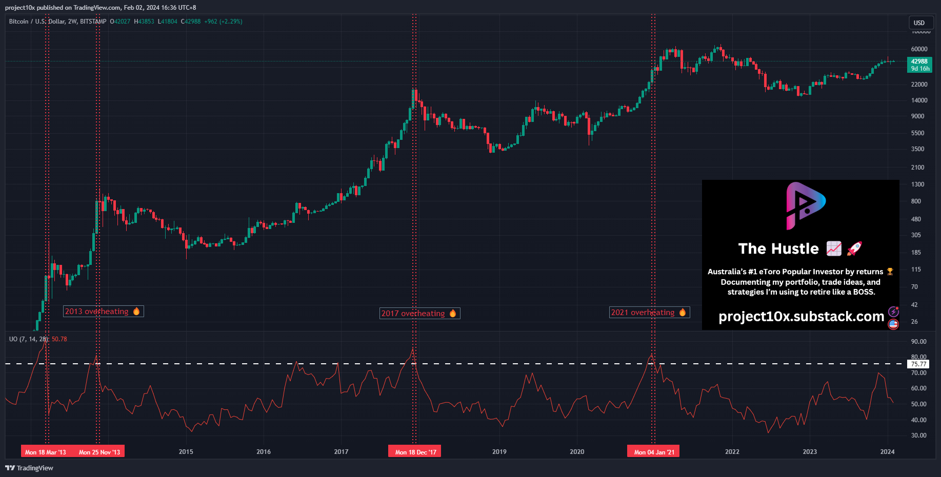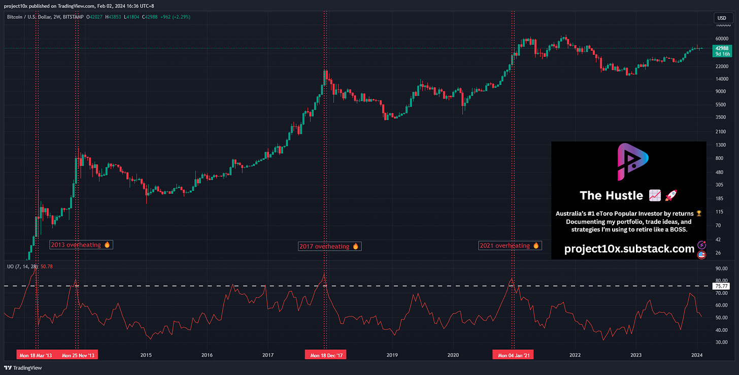 Signal: when the UO on the 2W BTC chart breaks above 75.77, then starts to reverse.