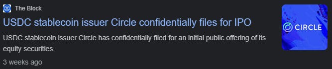 Status: It’s only February 2024. We haven’t even had the BTC halving and our first IPO bingo card has been checked off. Thank you, Circle (the Company behind the stablecoin USDC).