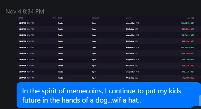 Business Holdings: As a responsible* business owner, I maintain an 80% allocation of my balance sheet in crypto š¤¤, which includes holding assets like WIF. This portfolio is moderately risk-seekingānot as aggressive as my personal portfolio, but still focused on growth.